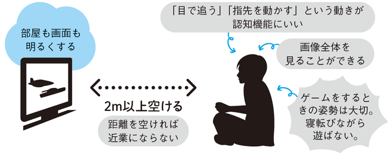 実際、「ゲームが得意な子どもほど学業成績がよい」という研究もあり、子どもにも大人にもテレビゲームがよい影響を与える場合もあるのです。ただし、室内にこもりきりは禁物。特に目の成長初期にある6歳以下は、外で遊び、日光を浴びることが重要です。