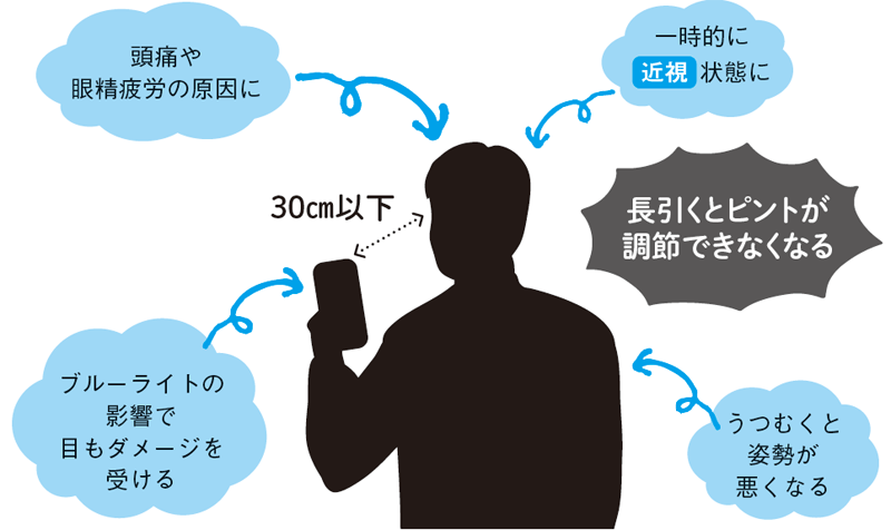 一方、スマホゲームは目に悪影響を及ぼしやすいといえます。画面が小さく、30センチ以下の近距離で使いがち。この状態で長時間見つめると毛様体筋が緊張し続け、ピント調節がうまくできなくなる「調節緊張」が生じやすくなります。また、近距離でブルーライトを浴びることで、眼精疲労や睡眠リズムの乱れにもつながります。
