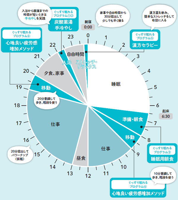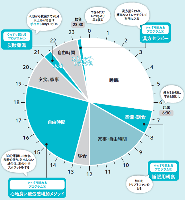 炭酸薬湯/②手冷やし/③睡眠用朝食/④心地良い疲労感増加メソッド/⑤漢方セラピー
