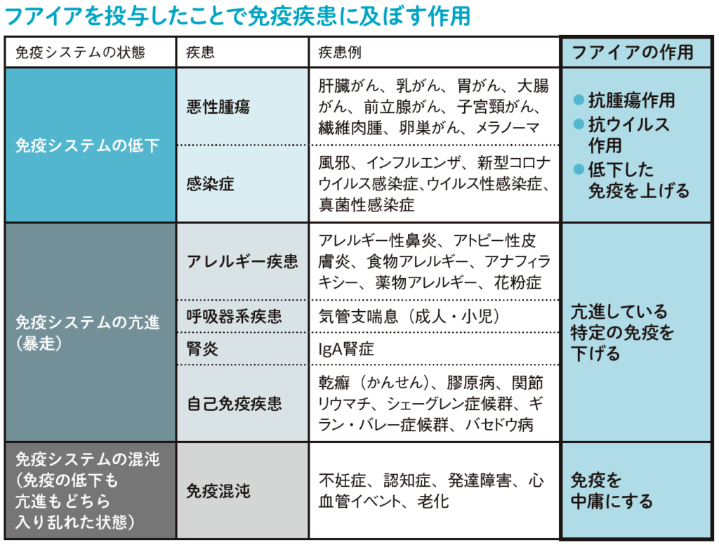 | 免疫システムの状態 | 疾患 | 疾患例 | フアイアの作用 |