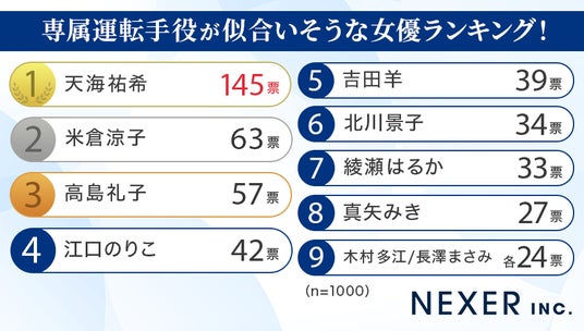 ということで今回は株式会社トランスアクトと共同で、全国の男女1000名を対象に、「『専属運転手役が似合いそう』と思う女優」についてのアンケートをおこないました。