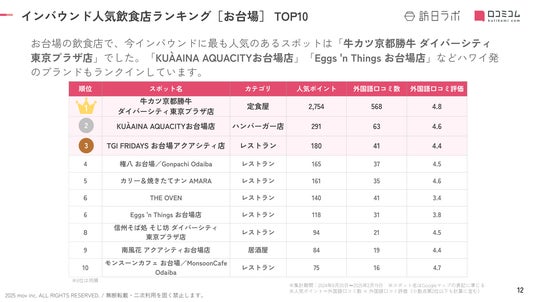 2位はKUA`AINA AQUACITYお台場店、3位はTGI FRIDAYS お台場アクアシティ店!1位は?2025年最新:外国人に人気の飲食店ランキング[お台場 編]| インバウンド人気飲食店ランキング【mov独自調査】#インバウンド #MEO