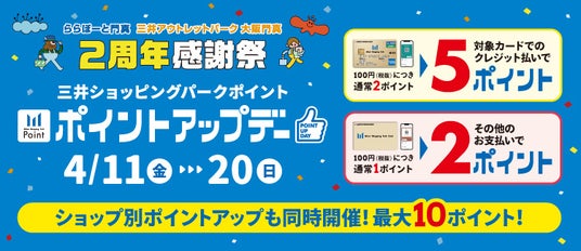 ■2周年感謝祭 企画 その他展開 ・ 三井ショッピングパークポイント ポイントアップデー 期間中は100円(税抜)につき最大10ポイントが付与される、三井ショッピングパークポイント ポイントアップデーを実施いたします。