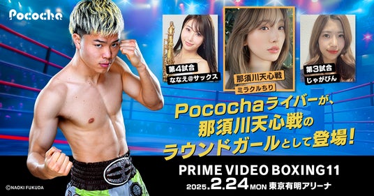Pocochaでは、2024年11月に「ボクシング・那須川天心戦」ラウンドガール出演権をかけたアプリ内イベントを開催しており、多数のライバーの中から1位に輝いた「ミラクルちり」が決定しました。また、同イベントに上位入賞した「ななえ@サックス」と「じゃがぴん」の2名も、「Prime Video Boxing 11」他試合のラウンドガールとして登場します。