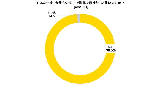 今後のタイミーの利用意向については、98.5%もの人が「今後もタイミーで副業を続けたい」と回答。アプリの使いやすさや求人数の多さなどの利便性に関する理由が多く挙げられていた一方で、「本業とは違うやりがいを感じる」「自己肯定感が上がる」「人間関係が広がる」という理由で今後もタイミーで副業を続けたいと思っている方がいることがわかった。