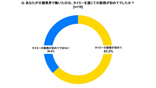 副業としてタイミーで介護関連の仕事をしたことがある無資格者に対して、介護業界で働いたのが初めてだったかどうかを聞いたところ63.2%がタイミーでの勤務で初めて介護業界で働いたと回答。
