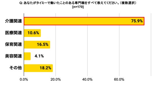 タイミーを通じて専門職で副業をしたことのある人のうち、介護関連で働いたことのある人は75.9%。そのうち介護関連の資格を保有している人は85.3%と有資格者が多い一方で、無資格者も一定数いることがわかった。