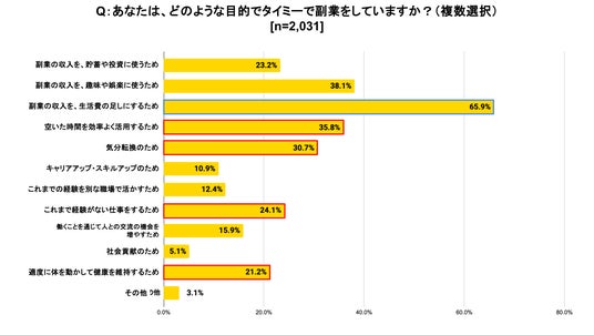 - タイミーで副業をする目的として最も多かったのは「副業の収入を、生活費の足しにするため」であった一方、「空いた時間を効率よく活用するため」「気分転換のため」「これまで経験がない仕事をするため」「適度に体を動かして健康を維持するため」など、収入を増やすだけではない目的で利用する人も一定数いることが判明。
