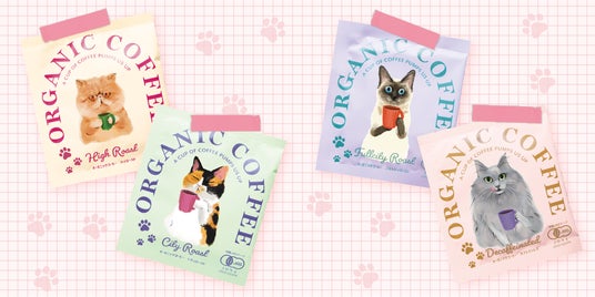 オーガニックコーヒーのドリップパック。ハイロースト(エキゾチックショートヘア)、シティロースト(ミケ)、フルシティロースト(シャム)、カフェインレス(ネベロング)の4種類。