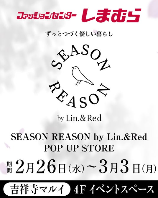 株式会社しまむら(本社所在地:埼玉県さいたま市大宮区北袋町1-602-1、代表取締役:鈴木 誠)は、2月26日(水)より吉祥寺マルイにて期間限定POP UP STOREを出店します。「SEASON REASON(シーズンリーズン)」新作商品の先行販売やノベルティなど、多数のお楽しみいただける内容をご用意しています。ご来店を心よりお待ちしております。