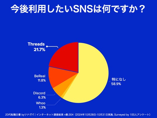 20代が普段最もよく利用するSNSは?20代5人に1人が「Threadsに関心!」SNS利用とコミュニケーションに関する意外な調査結果を発表!採用戦略やターゲット理解に役立つインサイト|第5回20代転職白書Byツナグバ