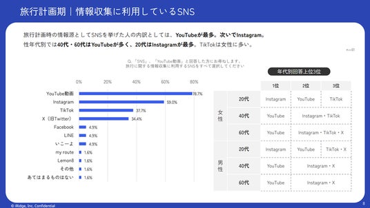・旅行計画の情報源にSNSを挙げた人の内訳では、YouTube(78.7%)が最多で、次いでInstagram(59%)だった