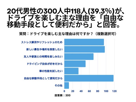 20代男性の300人を対象とした「ドライブを楽しむ主な理由は何ですか?」というアンケートで118人(39.3%)が「自由な移動手段として便利だから」という結果になりました。