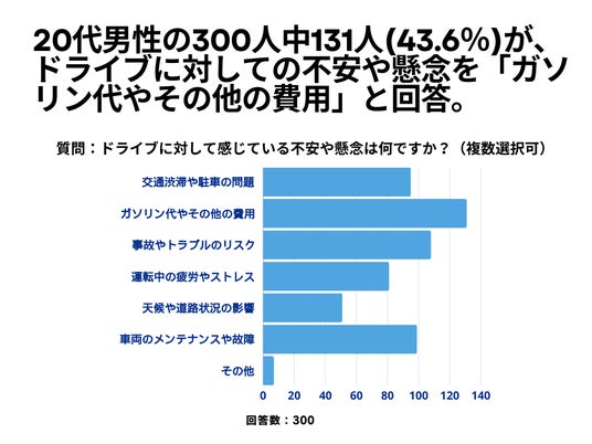 20代男性の300人を対象とした「ドライブに対して感じている不安や懸念は何ですか?」というアンケートで131人(43.6%)が「ガソリン代やその他の費用」という結果になりました。