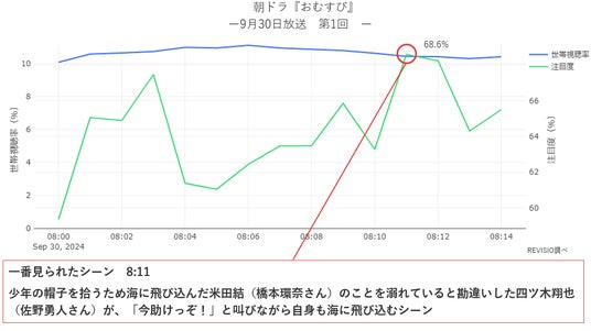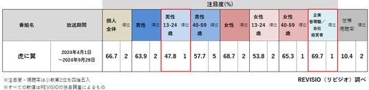ご家庭に人体認識技術を搭載した機器を設置し、テレビスクリーンへの「アテンション(注視)」を測るREVISIO株式会社(本社:東京都千代田区、代表取締役社長 郡谷康士、以下REVISIO)は、2024年4月~9月に放送されたNHKドラマ『虎に翼』を、注視データで分析しました。なお、「注目度が高い」とは、テレビの前の視聴者が画面にくぎづけになっている度合が高かった様子を表します。また、本記事内で扱うデータは視聴率も含めすべてREVISIOの独自調査によるものです。