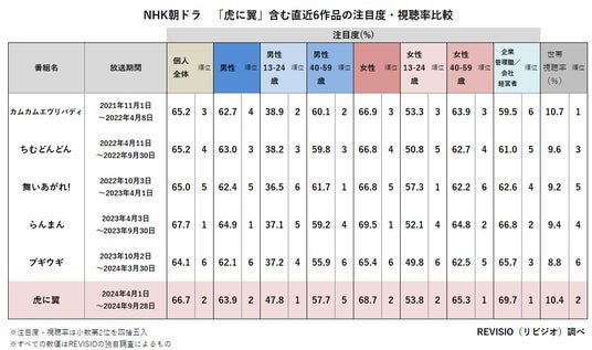『虎に翼』は注目度・視聴率ともに過去5作品と比較して高い傾向