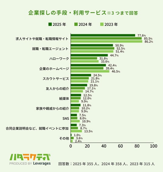 転職活動における就職先探しの手段や利用したサービスを尋ねると、3年連続「求人サイトや就職・転職情報サイト」が最多となりました。