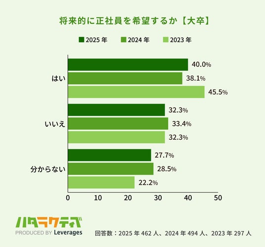 現在フリーターとして働いている人に「将来的に正社員を希望するか」を尋ねたところ、大卒フリーターにおいて、「はい」と回答した人の割合が2023年(45.5%)から2025年(40.0%)で5.5pt減少していることがわかりました。正社員を希望するか「わからない」と回答した割合は、2023年より2年連続5pt以上増えています。
