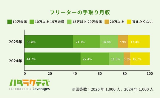 フリーターの手取り月収について、前年度と比較すると、15万円未満の層が減少し、15万円以上の層が増加したことがわかりました。