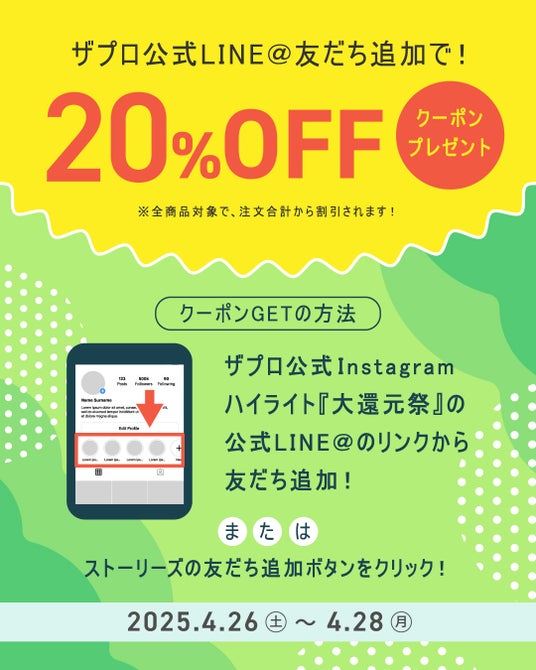 ・内容:ザプロの公式LINE@のお友だち追加で、注文合計から20%OFFになるクーポンを配布