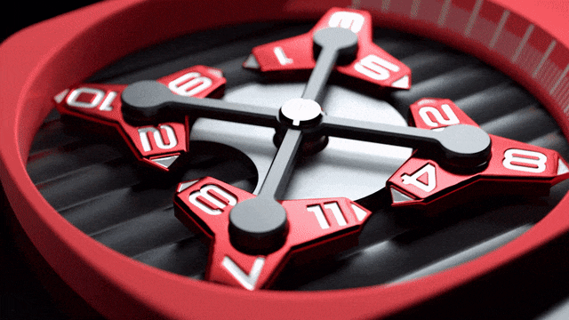 独特で斬新なデザインはそのままに、主に高級腕時計で採用されているWandering Hour方式を加えました。