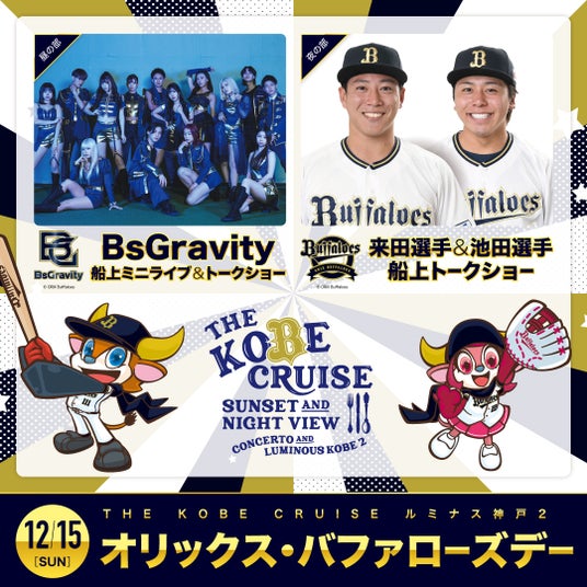 THE KOBE CRUISEとオリックス・バファローズが贈るスペシャルイベントが今年もやってきます! 2024年12月15日(日)、「オリックス・バファローズデー」と題して、ルミナス神戸2がまるごとオリックス仕様の一日になります。夜の部では、今シーズン大活躍の来田涼斗選手と池田陵真選手が登場!さらに、BsGravityによるミニライブや選手とのトークショーが予定されています。MCはオリックスファンにお馴染みの神戸佑輔さんが務め、笑顔と感動のひとときをお届けします。船の上で、オリックスの選手たちやBsGravityと特別な時間を過ごしてみませんか?今年最後の思い出をぜひルミナス神戸2で!