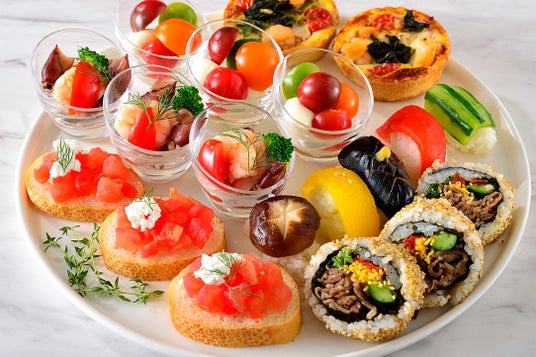 - 狭山茶蕎麦のイタリアン、焼き野菜のカルパッチョ、ムール貝とインゲンのサラダ、完熟茄子のムース、燻製ハンバーグ(Cobara-Hetta・なかのグリルより)