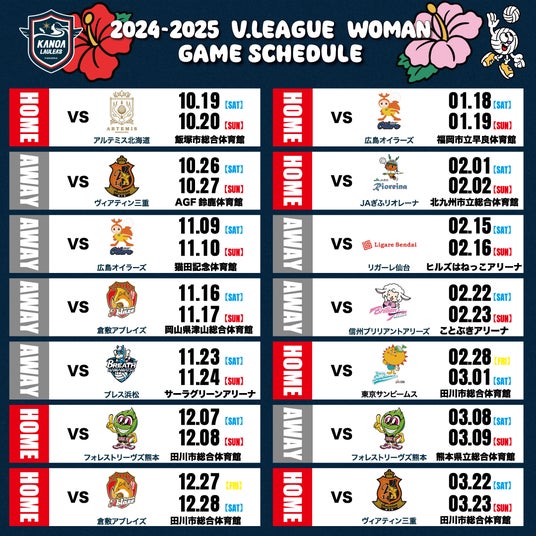 この度、2024-25V.LEAGUE WOMENの試合日程が決定しましたのでお知らせいたします。 試合時間については決まり次第、あらためて随時お知らせいたします。