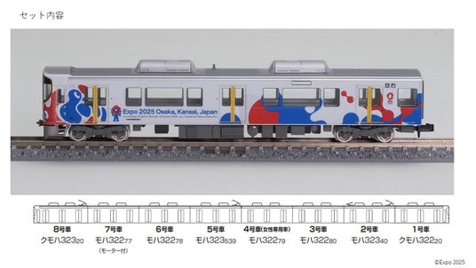 「2025年大阪・関西万博」が2025年4月13日、ついに開幕を迎えます! JR西日本グループは、「大阪環状線」において、323系「大阪・関西万博ラッピング列車」を運行しており皆さまに大変ご好評をいただき、万博の機運醸成を高めております。 このたび、JR西日本の鉄道デザイングッズブランド「トレインボックス」から、白色を基調とした車体に「ミャクミャク」などのカラフルなイラストを施し、精密なディテール再現と美しいデザインが魅力となった「TOMIX製オリジナルNゲージ 323系大阪・関西万博ラッピング列車8両セット」を発売します! さらに、「トレインボックス」ならではのオリジナルアイテムを2つ付属し、「いまだけ」「ここだけ」しか手に入らない「特別感」のあるセット内容となっています。 1.商品名・商品画像 「TOMIX製オリジナルNゲージ 323系大阪・関西万博ラッピング列車」(8両セット) 2.発売日・価格 発売日:2025年4月 15日(火)正午~ 受注開始 ※商品は2025年4月19日(土)以降、順次発送します。 価 格:39,600円(税込)  3.商品詳細 (1)全車両フルラッピングの大阪環状線323系を再現!大阪環状線を走行する 323 系に大阪・関西万博の公式キャラクター「ミャクミャク」などがデザインされ、白色をベースとしたカラフルなラッピング列車。 全8両編成の各車両に描かれた、ミャクミャク達や文字・標記類も可能な限り再現しています。 (2)「列車種別・行先表示パーツ」323系の列車種別・行先表示の交換用パーツを付属します。(全6種の列車種別・行先表示を付属) 3月より運行を開始した「エキスポライナー 新大阪」等に付け替えて頂くことが可能です。 ※今回の8両セットの出荷時の仕様は「普通・大阪環状線」が装着されています。 (3)「A4クリアファイル」JR西日本が業務用で実際に使用している「323系整備用マニュアル(業務用)」をリデザインしたA4クリアファイルを付属しています。 4.実車紹介 323系は2016年に登場した大阪環状線用の車両です。 103・201系と異なり片側3扉となり、運転機器類の二重系統化など安全性も向上しました。 現在22編成176両が活躍しており、大阪環状線及びJRゆめ咲線をメインに運行中です。 2025年3月より運行を開始した「エキスポライナー」の運用にも就いています。 大阪・関西万博ラッピング列車は会期終了後、ラッピングを撤去するまで運行予定です。 また、その他、「JR WEST Parade Train」も運行しています。 5.販売箇所 ・ジェイアール西日本商事通販サイト「トレインボックス」 https://www.trainbox.jp ・JR西日本公式産直オンラインショップ「DISCOVER WEST mall」 https://dwmall.westjr.co.jp/shop/default.aspx ・トレインボックス WESTERモール店 https://wester-mall.westjr.co.jp 6.お知らせ ・以下の公式SNSでも当商品をご紹介いたします。 「トレインボックス」(ジェイアール西日本商事) Facebook:https://www.facebook.com/jrwtrading X(旧Twitter):https://x.com/TRAIN_BOX Instagram:https://www.instagram.com/trainbox_jrwt ・ハガキ、お電話での申込み受付は行っておりません。 ・ご注文はお1人様3個を上限と致します。 ・販売予定総数に達し次第受付を終了させていただきます。 (販売予定総数のお問合せはご容赦下さい)。 ・商品は順次発送対応しておりますので、納品日のお問い合わせはご遠慮願います。 ・内容・価格や販売箇所は変更する場合がございます。また、急遽販売を終了する場合がございます。 ・記載の販売価格は、上記販売箇所での税込価格となります。 (販売箇所によっては販売価格が異なる場合がございます。) ・発売日や商品の仕様は、予告なく変更する場合がございます。 ・それぞれの画像はイメージです。実際と異なる場合がございます。 ・本商品にはレールは付属しておりません。