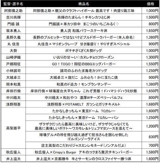 「プロデュース弁当」に負けない人気の「監督・選手プロデュースグルメ」が、今年も登場します。新たに岸田選手、浅野選手、井上選手の3名が加わり、監督・選手によるグルメは、こだわりが満載です。