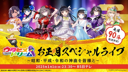 株式会社アース・スター エンターテイメント(本社:東京都品川区、代表取締役社長:幕内和博)が展開するメディアミックス音楽プロジェクト「ウタヒメドリーム」につきまして、2025年1月1日(水)23:30にBS日テレにてお正月特番の放送が決定いたしました。