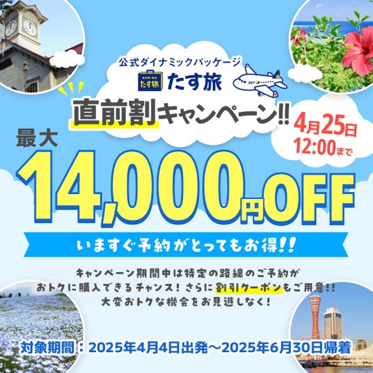 4月25日(金)12:00まで最大14,000円OFFクーポンが使える「直前割キャンペーン」を実施中です!