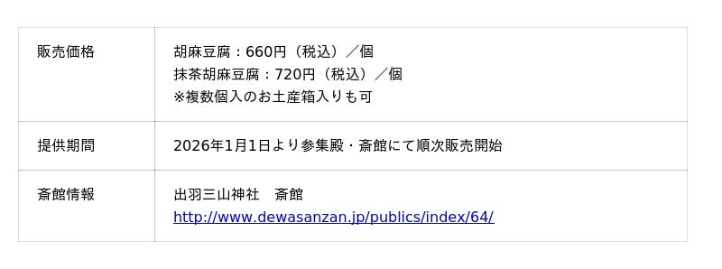 一年を通した御縁年では、羽黒山山頂の「三神合祭殿」での参拝はもちろん、2446段の石段を白いお注連(おしめ)を身に着けて歩む「石段詣」(春~秋限定)も、自身と向き合う特別な時間となります。 また、月山と湯殿山の開山期には三山すべてを巡る出羽三山参りも行うことができます。羽黒山の御縁年にあたる2026年は、三山への祈りと向き合う時間に、特別な意味が重なる年です。 さらに、2026年7月から9月にかけては、鶴岡を含む庄内地域がJR東日本の夏のキャンペーンエリアに選ばれています。御縁年の流れとあわせて、羽黒山の多彩な魅力に触れていただける機会が、より広がっていく予定です。 関連URL つるおか観光ナビ-【特集】2026年は12年に一度の特別な「羽黒山午歳御縁年」 出羽三山神社 公式サイト 出羽三山神社 公式Instagram 出羽三山神社 公式X DEGAM 公式Instagram つるおか観光ナビ-【ニュース】JR東日本「山形庄内」観光キャンペーン開催決定!【2026年夏】 お問合せ先