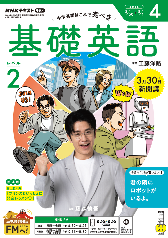 2026年度は『小学生の基礎英語』『基礎英語 レベル1』『基礎英語 レベル2』の3つの講座でお届け。2025年度にタレントの藤森慎吾さんが登場し、話題になった『基礎英語 レベル2』につづき、今年度は『基礎英語 レベル1』が、新講師を迎え構成もリニューアル。生徒役の鈴木 楽さん、講師は実際の中学校で教壇に立つ中島真紀子先生が、ライブ感溢れる講義をお届けします。学生の方はもちろん、学びなおしをしたい大人の方にも、おすすめです。
