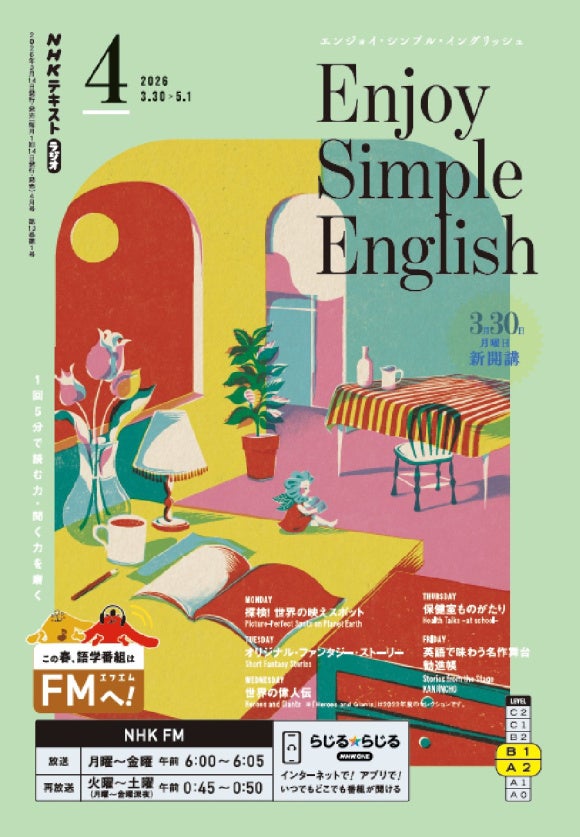 本日、2026年3月30日からスタートする講座に向けて、2026年4月号が発売となりました。前年度につづく「基礎英語」シリーズのリニューアルや、人気講座『ラジオ英会話』テキストなど、今年も強力なラインナップでお届けします。同時発売の人気シリーズ英語ムックと併せてご紹介します。