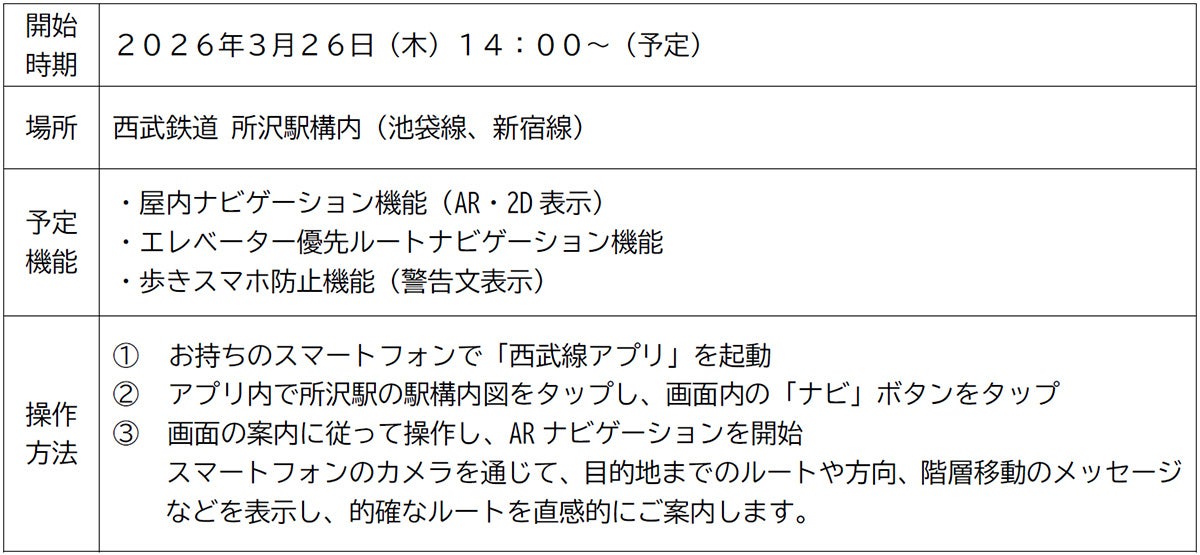 西武鉄道株式会社(本社:埼玉県所沢市、社長:小川 周一郎、以下「西武鉄道」)とアイテック阪急阪神株式会社(本社:大阪市福島区、社長:水本 好信、以下「アイテック阪急阪神」)は、お客さまの利便性向上や、シームレスな移動・暮らし、スマートな事業運営の実現に向けたDX施策の一環として、2026年3月26日(木)から西武鉄道の公式スマートフォンアプリ「西武線アプリ」において、所沢駅構内で利用できるAR※1ナビゲーション機能の技術検証を実施します。