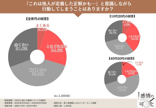 『「これは他人が定義した正解かも…」と意識しながら行動してしまうことはありますか?』と質問したところ、「よくある(5.1%)」「ときどきある(24.6%)」と、SNSにより動いた感情で行動を起こす人が3割程度いることがわかりました。