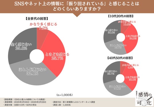 さらに興味深いのは、10代、20代は「かなり多く感じる(10.3%)」「ときどき感じる(34.0%)」と、4割近い人が、SNSに感情を振り回させていると感じている一方、40代、50代は「かなり多く感じる(4.3%)」「ときどき感じる(30.0%)」と、年代により差があることもわかりました。