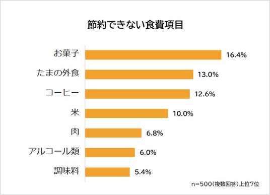 「これだけは節約できない」という食費項目を聞いたところ、1位は「お菓子(16.4%)」、2位「たまの外食(13.0%)」、3位「コーヒー(12.6%)」という結果に。 お菓子やコーヒーなど、嗜好性の高い食品が上位にランクインしています。節約意識がある中でも、ささやかな楽しみや満足感は失いたくないと考えている人が多いとわかりました。 また、米や調味料など食生活の基盤を支えるような項目もランクイン。「節約しつつも、主食の味や食事の質を下げすぎるのは嫌」という意識が見えます。 <1位 お菓子> ・たまに無性に甘い物が食べたくなるので、必要ないとは理解してはいても、スーパーでパック入りのケーキを定期的に買います(40代 女性)