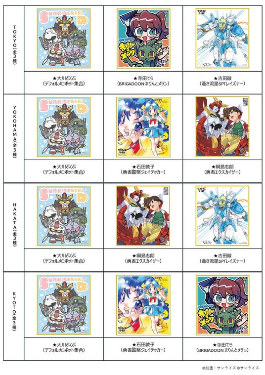さらに、物販購入特典として3,000円(税込)ご購入ごとにランダムでプレゼントしている、クリエイター描き下ろし複製ミニ色紙には、『デフォルメロボット集合』、『蒼き流星SPTレイズナー』、『勇者エクスカイザー』、『勇者警察ジェイデッカー』、『BRIGADOON まりんとメラン』のミニ色紙が新登場。それぞれ、大川ぶくぶ、吉田徹、綱島志朗、石田敦子、寺田てらが描き下ろしたイラストをデザインした、サンライズワールドでしか手に入らないオリジナル特典です。