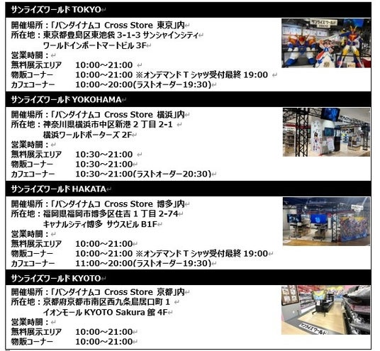 これまで制作された300を超えるサンライズブランド作品を、フォトスポットなどの無料展示、オリジナルグッズなどの物販、カフェコーナーを通して【見て知って楽しんでいただく店舗】として展開中。現在は、東京、横浜、博多、京都の4店舗にて開催しています。