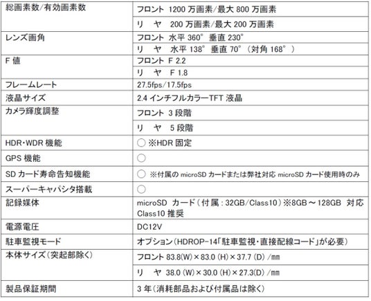 SDカードは消耗品です その他の特長 ■フロント360°カメラで全方位を記録。さらにリヤカメラで後方をしっかり記録。 【フロント360°カメラ】 前方左右車内を記録 フロントには360°カメラを採用。前方の映像だけでなく、側方・車内の映像も記録可能。