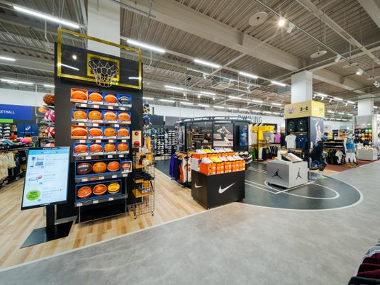 コートをイメージした床の装飾と、ジョーダンブランドを展開するサークル型の特設売場で臨場感たっ