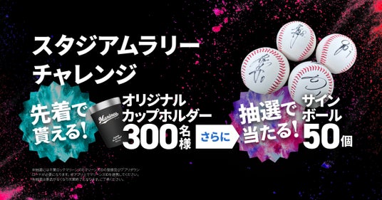 5つの謎を全て解き終わったスタジアムラリー参加者先着300名様に、オリジナルカップホルダーをもれなくプレゼント。また、ルーレットを回して当選した50名様にサイン入りボールをプレゼントします。 ・50名様にレプリカユニホームが当たる!ヒット数予想チャレンジ!  5 回裏までにマリーンズが打つヒットの数を予想しよう!