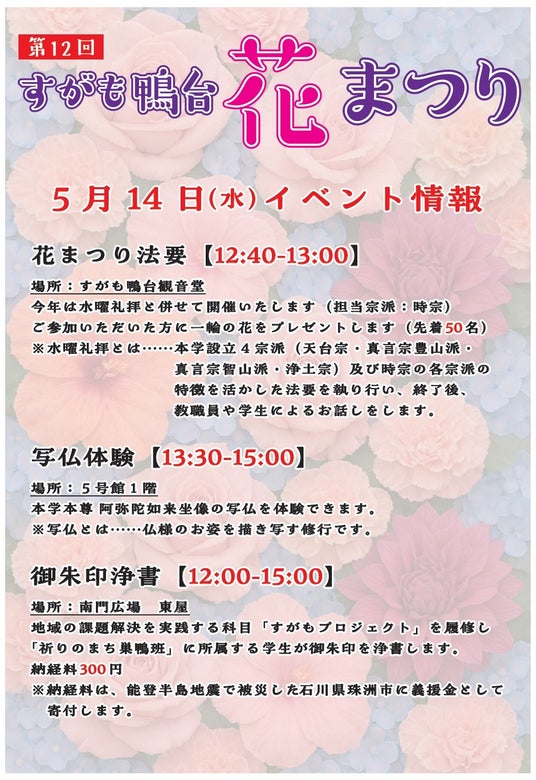 3. 5月14日(水)は「花まつり法要」を同時開催します。また、写仏体験や本学学生による御朱印浄書のイベントも実施します