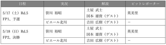 5/17(土)・18(日) SUPER FORMULA 第5戦 放送情報 年に一度の九州大会 オートポリスを制するのは誰だ!公式放送ゲスト解説 国本雄資選手、場内放送ゲスト解説 吉田広樹選手