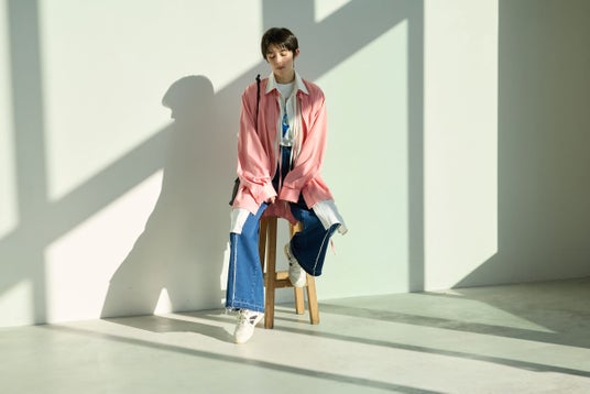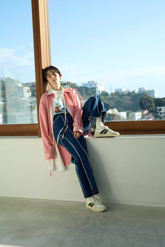 そんな新作のコーディネート、アイテムごとはエッジーにし、足元はローテク調のホワイトスニーカーですっきりまとめました。モード×ストリートな、お出かけスタイル。