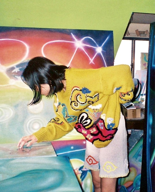【岩間有希(YUUKI IWAMA)】本能に身を委ねて描くスタイルは、気持ちの良い色彩や質感を出し、岩間らしさを作り上げている。頭の中で繰り広げられている世界や、目に見えない領域の情景、ピュアな心を呼び覚ますような表現をしている。また、絵画作品を軸としながらも、巨大バルーンスカルプチャーや、陶芸、ぬいぐるみ等、様々な表現媒体を用いながら、思いのままに制作している。