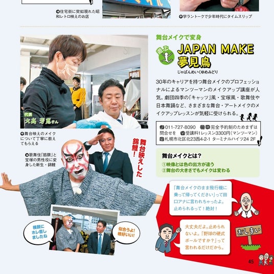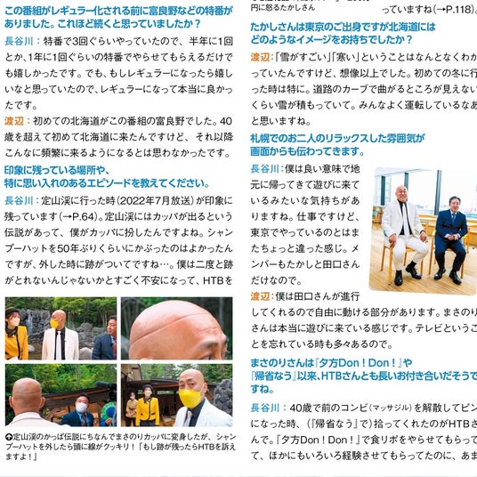 札幌出身の53歳・長谷川は、30歳まで札幌に住んでいたはずなのに、訪れる故郷の各地で「初めて」を連発!東京生まれ東京育ちで<北海道初心者>の相方・渡辺隆と同じ新鮮なリアクションで北海道の新たな魅力を発信中です。