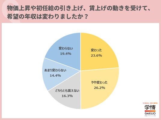 株式会社学情(本社:東京都中央区)は、20代の仕事観や働く意識をひも解くために、アンケート調査を実施しました。今回は、「年収」に関して調査。賃上げに積極的な企業について、「魅力を感じる」と回答した20代が96.7%に上りました。「仕事を頑張るモチベーションに繋がる」「給与が増えれば、物価高でも生活水準を落とさなくて良い」「賃上げに積極的な企業は、安定した売上・利益成長を図れている印象」「従業員を大切にしている企業だと感じる」といった声が寄せられています。また約半数の20代が、物価上昇や初任給の引き上げ、賃上げの動きを受けて、「希望の年収が変わった」と回答。「生活必需品や食品など、身近なモノの値段が上がっている」「生活費が上がっているので、年収が上がらないと貯蓄にまわすお金が残らない」「初任給が上昇傾向なので、より高い年収を望むようになった」などの声が上がりました。